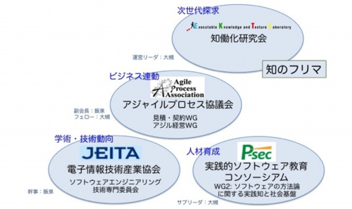 アジャイルプロセス協議会のWGの一つとして2009年7月に発足したアジャイルプロセスの次に来るものについて検討する活動です。大槻が運営リーダをつとめています。2010年に『新ソフトウェア宣言』をまとめ、2012年より『知のフリマ』という新しいワークショップスタイルを提言したりと活発な活動を展開しています。