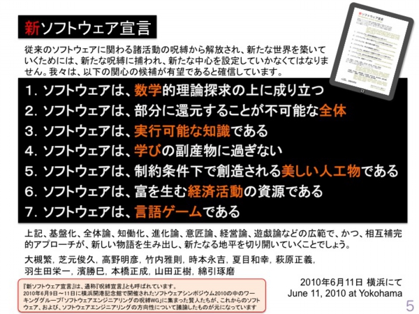 2010年6月9日〜11日の3日間にわたって横浜開港記念館にてソフトウェアシンポジウム2010が開催されました。『ソフトウェアエンジニアリングの呪縛』と題したワークショップを企画し、最終的に『新ソフトウェア宣言』として、今後のソフトウェアの方向性についてまとめました。