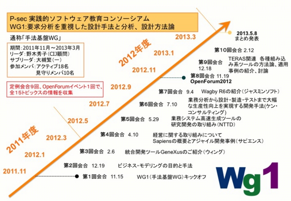 特定のツー ルによらないモデリング手法、設計手法、開発方法論や適用事例について、調査・分析を進めてきました。そのた めに、現在、市場に出ている各種ツールについて、ツール開発会社の担当者からの発表も聞き、多くの事例を得る ことができました。2013年3月に活動報告書を作成し、一区切りつけてWG1の活動を終了しました。