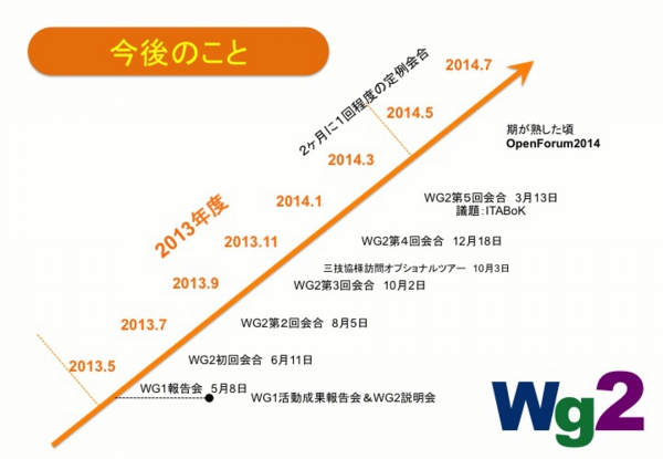 WG2の活動方針については、2013年11月に三技協様への訪問時にまとめた資料があるので、参考にしてください。この資料の後半にWG2が目指す「知のプラットフォーム」について私見をまとめています。
