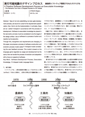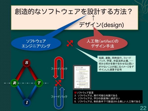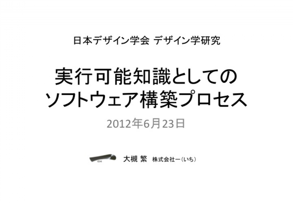 2012年4月より日本デザイン学会に入会し、2012年6月23日に、札幌で開催された日本デザイン学会にて『実行可能知識としてのソフトウェア構築プロセス』の講演を行いました。この発表で、2010年元旦の『ΛVモデル』以降の活動で、『新ソフトウェア宣言』や創造的なソフトウェア開発に関する考察を、まとめることができました。