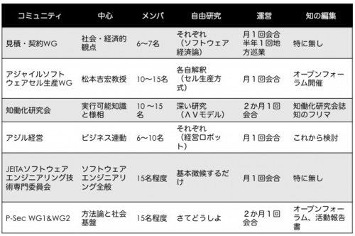 山田氏をコンセプトリーダとして、大槻が運営リーダとして活動をしていくことにしました。「知働化研究会」という名称は、知が働くという知識主導社会を目指すという文字通りの意味と、「人働説から知働説へ」というコペルニクス的転回を想起させてパラダイムシフトを図ることを狙ったものです。ワーキンググループではなく、研究会としたのは、当時から本論文で述べている「自由研究」を運営方法として意識し始めたことも影響していると思います。一方で、「ソフトウェア」や「アジャイル」といった言葉は、表立って使わないように意識しました。