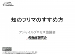 2009年6月に発足したアジャイルプロセス協議会/知働化研究会では、2010年6月に『新ソフトウェア宣言』、2011年11月3日に「知働化研究会誌創刊号」を発行し、コミュニティ活動として一段落して、今までにない実験的な取り組みをしようということになり、2012年11月3日の文化の日にイベントを企画することにし、約半年の準備期間を経て「知のフリマ」を開催しました。以降、知働化研究会主催の知のフリマは、半年に1回の頻度で開催し、2013年11月2日の第3回まで開催しました。以下は、主として第1回の折にまとめた『知のフリマのすすめ方』の紹介です。